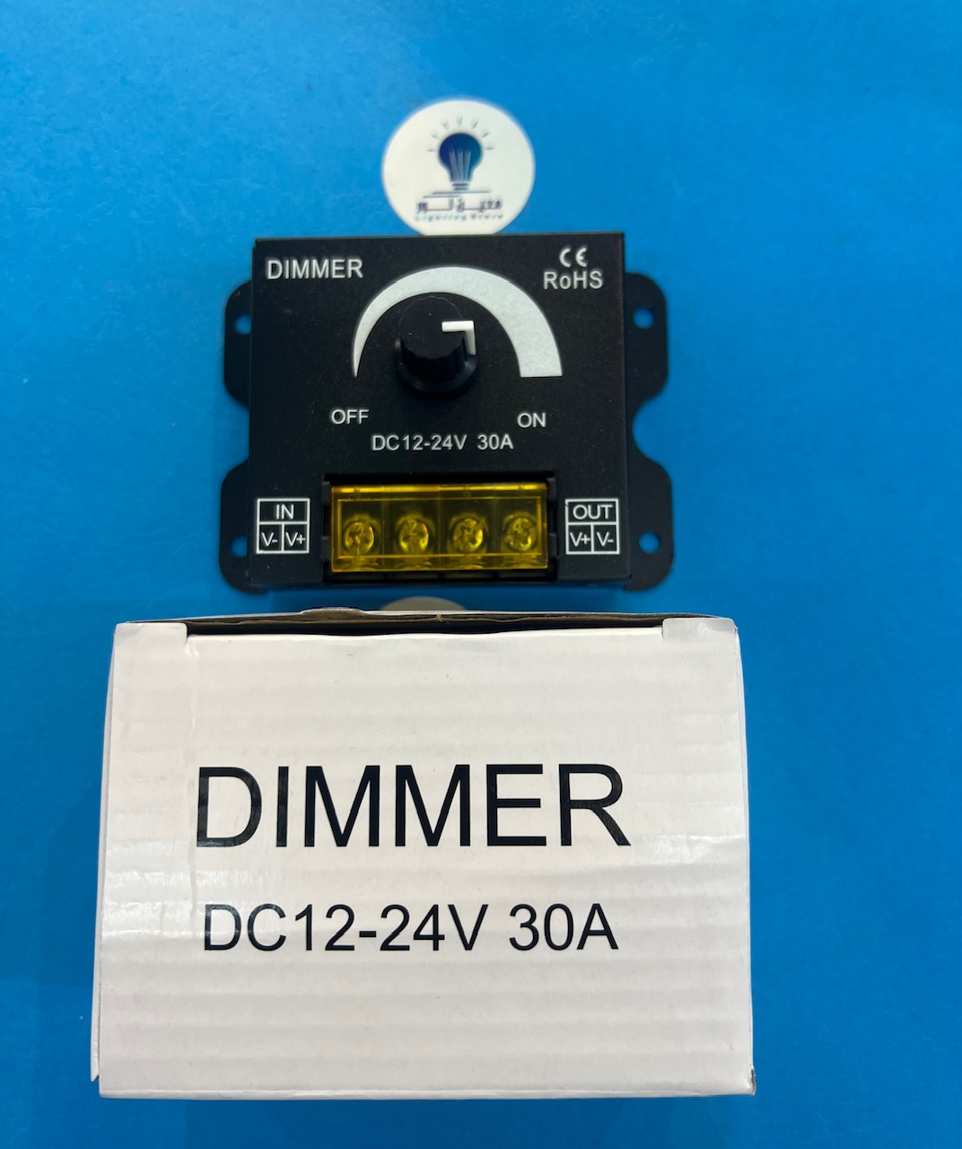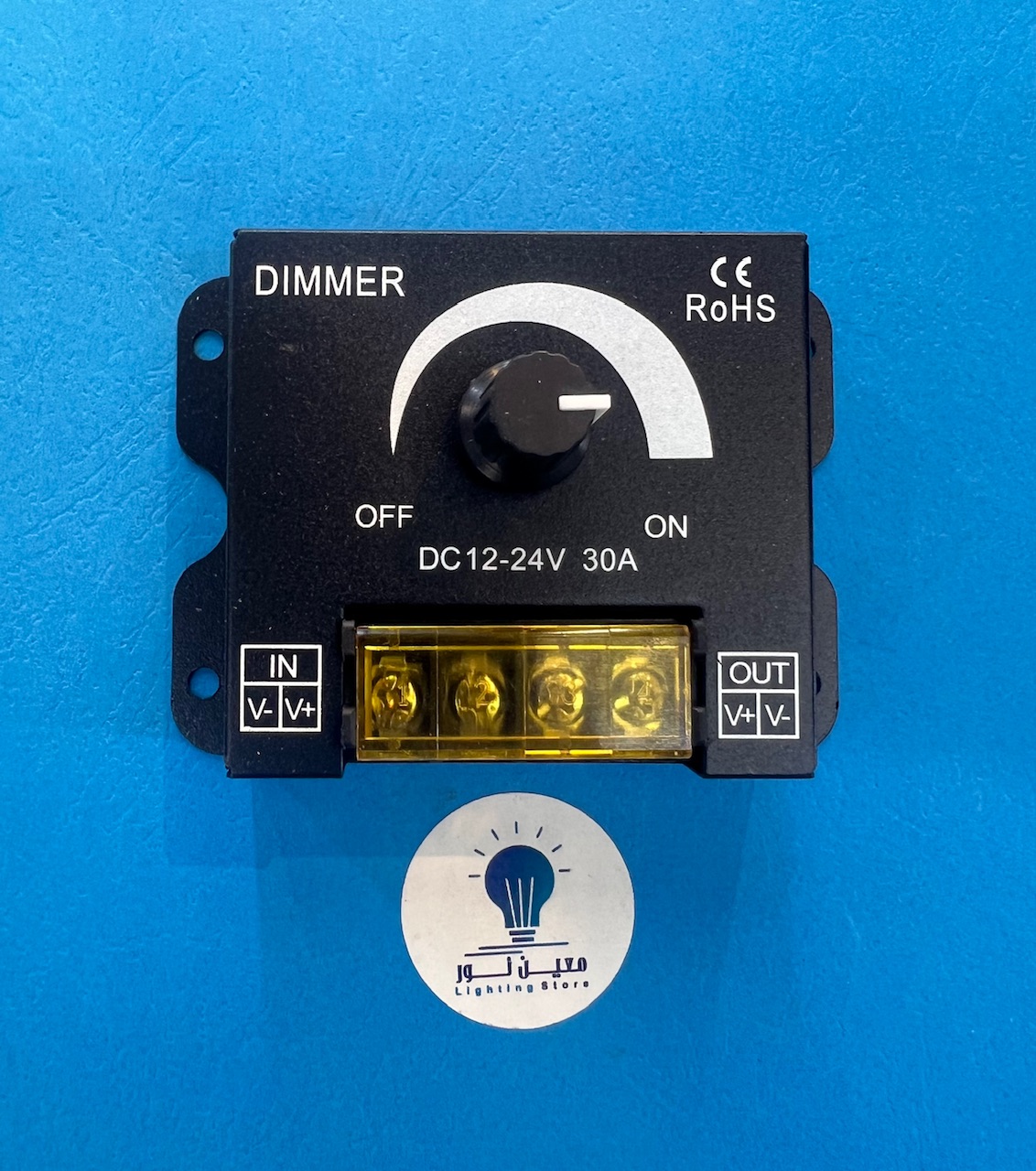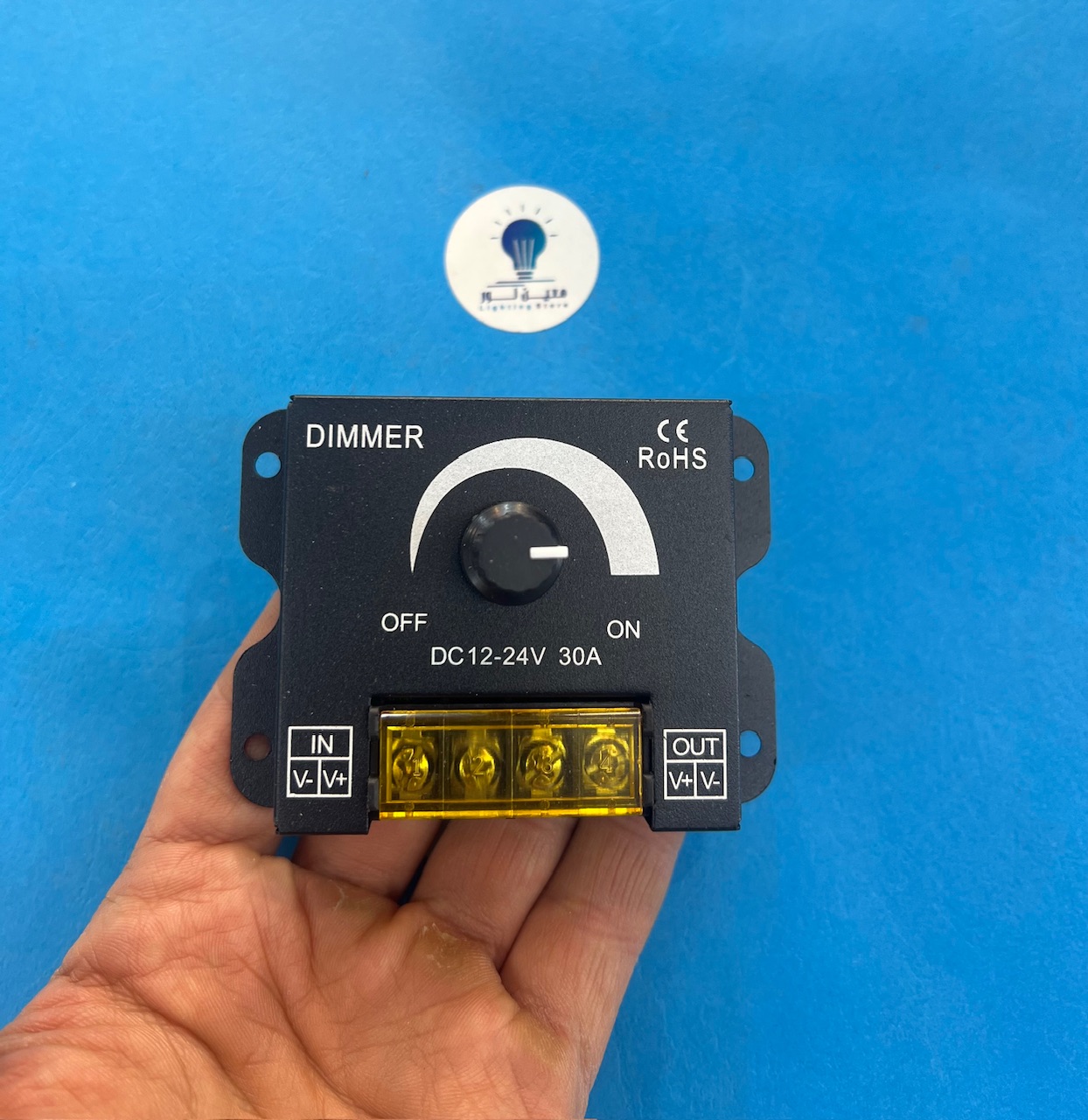 دیمر ۱۲ ولت و ۲۴ ولت ۳۰ آمپر ولومی برای تنظیم شدت نور از ۵ درصد الی ۱۰۰ درصد کاربرد دارد که این مدل بدون کنترل از راه دور میباشد ،شدت نور در این دیمر ۱۲ ولت توسط یک پیچ تنظیم یا ولوم روی دستگاه قابل تنظیم میباشد . توجه داشته باشد این محصول هم از ولتاژ ۱۲ و هم از ولتاژ ۲۴ ولت پشتیبانی می کند و توان خروجی ۳۰ آمپری دارد .
