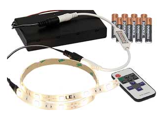 چراغهای ال ای دی 12V:چراغهای ریسهای ال ای دی برای عملکرد صحیح نیاز به ورودی برق12VDC دارند. به همین دلیل برای استفاده خانگی نیاز به یک ترانسفورماتور AC/DC وجود دارد و این کار باعث افزایش ایمنی در سیمکشی رشتهها در سرتاسر خانه میشود. همچنین چون خروجی باتری نیز یک ولتاژ DC است، میتوان به منظور سادگی بیشتر از چراغهای ال ای دی انعطافپذیری که از طریق باتری تغذیه میشوند استفاده کرد.