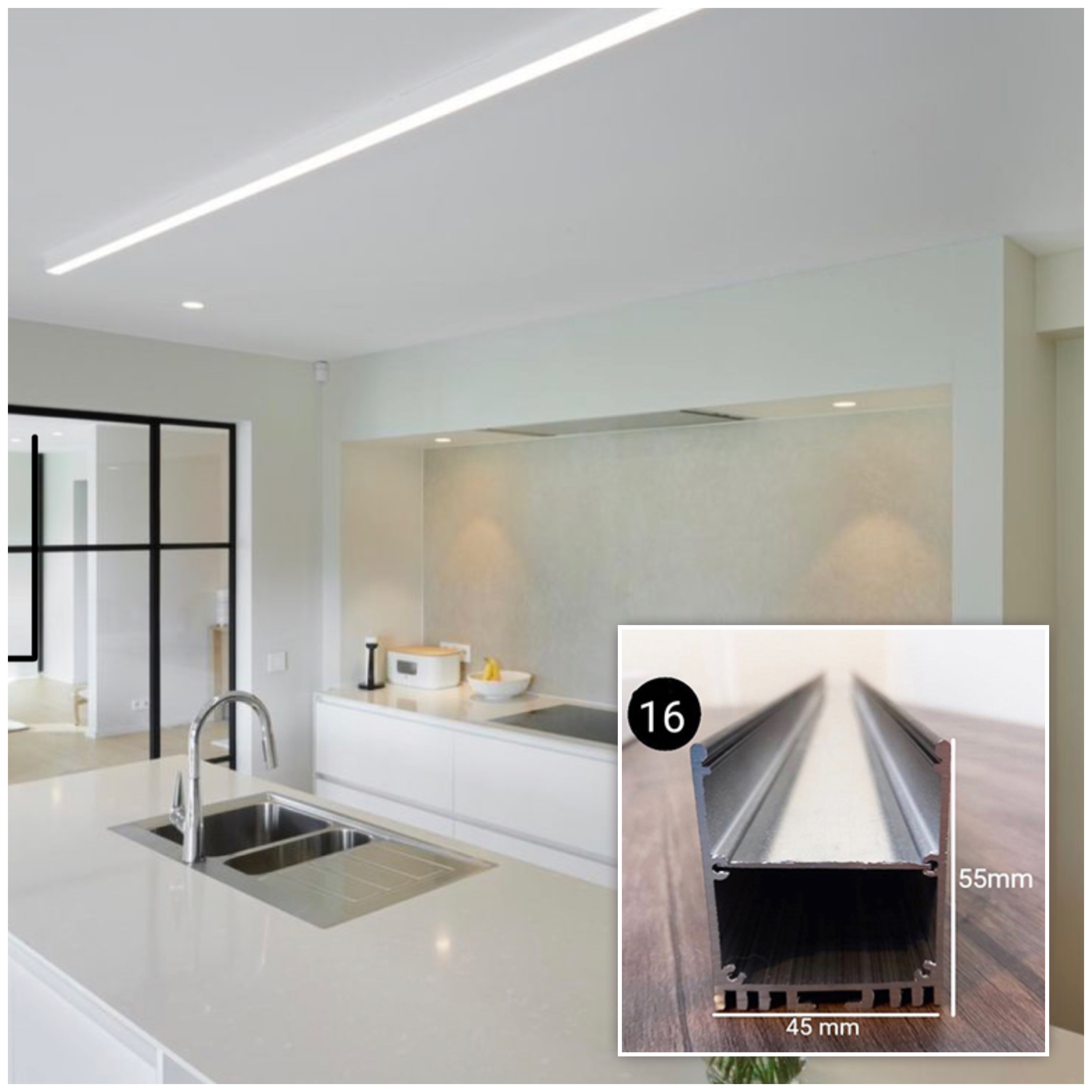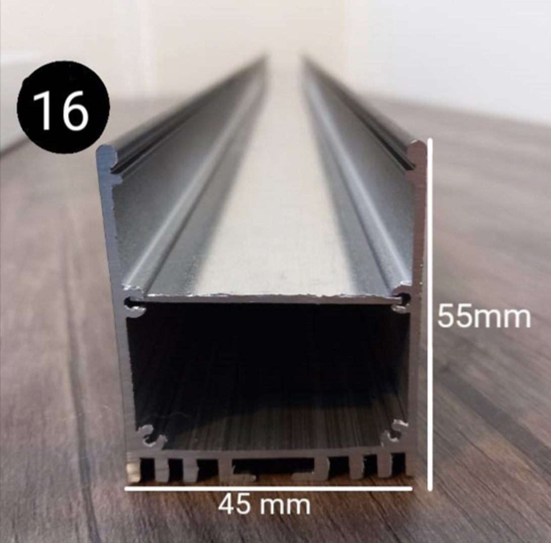 قاب لاینر نوری کد ۱۶ رویه ۴۵ میل ارتفاع ۵۵ میل تا شاخه 6 متری و در سه رنگ ، سفید ، مشکی و نقره ای قابل عرضه می باشد ، طلق رویه امکان ارائه تا رول ۵۰ متری جهت مکان هایی که نیاز دارید طلق به صورت یک تکه روی کار قرار گیردموجود است . این پروفیل یکی از سایز های پر مصرف جهت اجرای لاسن نوری آویز می باشد .برای انتخاب ریسه مناسب جهت استفاده در این پروفیل لاین نوری و تخمین قیمت تمام شده لاین نوری در قسمت پایین همین صفحه راهنمای خرید لاین نوری را مشاهده کنید ارسال به کلیه نقاط کشور .قیمت درج شده قیمت هریک متر از محصول می باشد . ابعاد داخل عکس کاملادقیق میباشد .این محصول در شاخه های 3 متری و 6 متری عرضه میگردد لطفا هنگام خرید مقدار را ضریبی از 3 یا 6 انخاب نمایید .قیمت بر حسب یک متر به همراه دفیوزر میباشد .