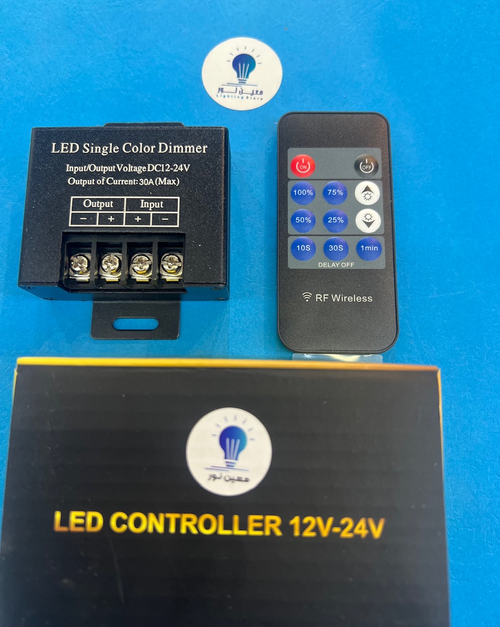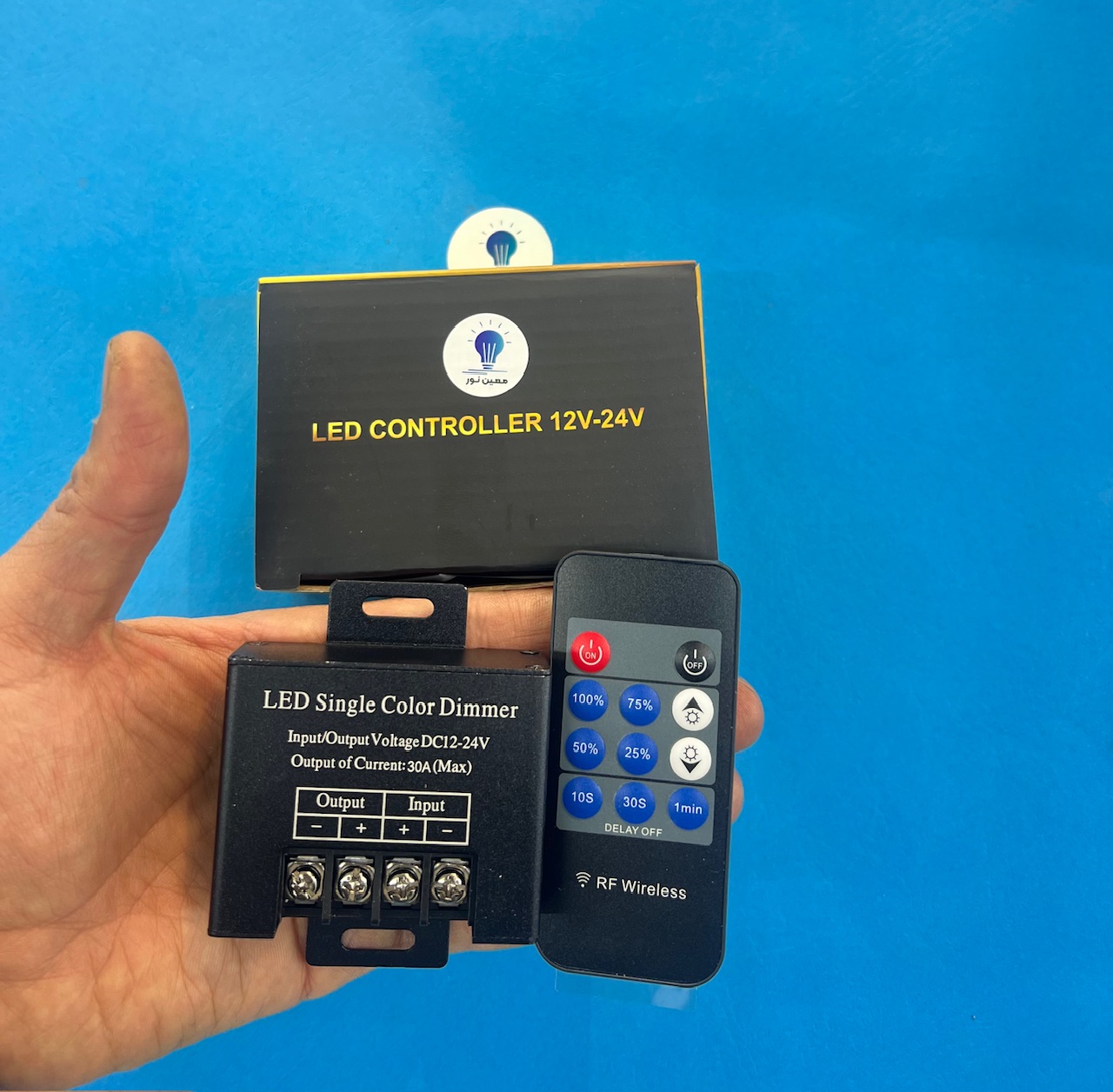 کنترل کننده شدت نور ریموت دار ۱۲ الی ۲۴ ولت ۱۱ کلید ، این ریموت کنترل قابلیت تنظیم شدت نور از صفر درصد الی ۱۰۰ درصد هر مصرفکننده ۱۲ یا ۲۴ ولتی را دارد . جریان عبوری مجاز از این دیمر ۳۰ آمپر میباشد که برای مثال اگر آنرا برای ریسه های ال ای دی با ترکم ۲۴۰ استفاده میکنید تا ۳۰ متر از این ریسه ها را می توانید به آن وصل کنید .برد کنترل این دستگاه ۳۰ متر میباشد که به صورت رادیویی میباشد و از پشت دیوار هم فرمان از کنترل به دستگاه میرسد .این محصول معین نور دارای ۱۸ ماه کارانتی بی قید و شرط میباشد .